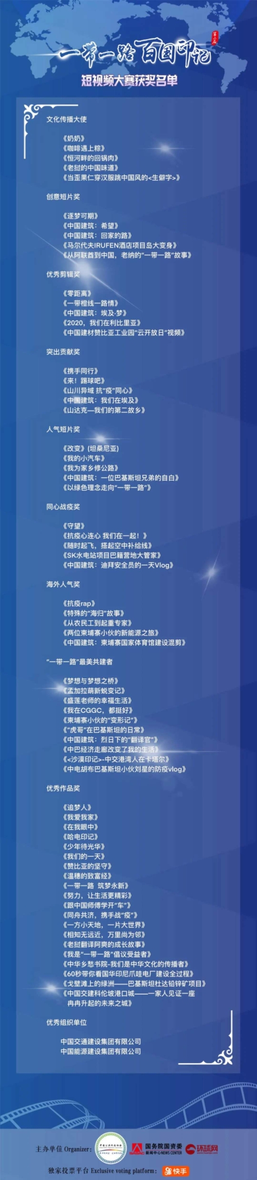 本屆大賽獲得了眾多參與“一帶一路“發(fā)展建設(shè)的大型企事業(yè)單位及個人的響應(yīng),共征集了來自近80個國家的500余部參賽作品。經(jīng)過公眾投票與專家評審的兩輪角逐,本屆大賽最終評選出文化傳播大使獎、創(chuàng)意短片獎、優(yōu)秀剪輯獎、突出貢獻(xiàn)獎、人氣短片獎、同心戰(zhàn)疫獎、海外人氣獎各5名,“一帶一路”最美共建者 10名,優(yōu)秀組織單位 2個,優(yōu)秀作品獎20名。