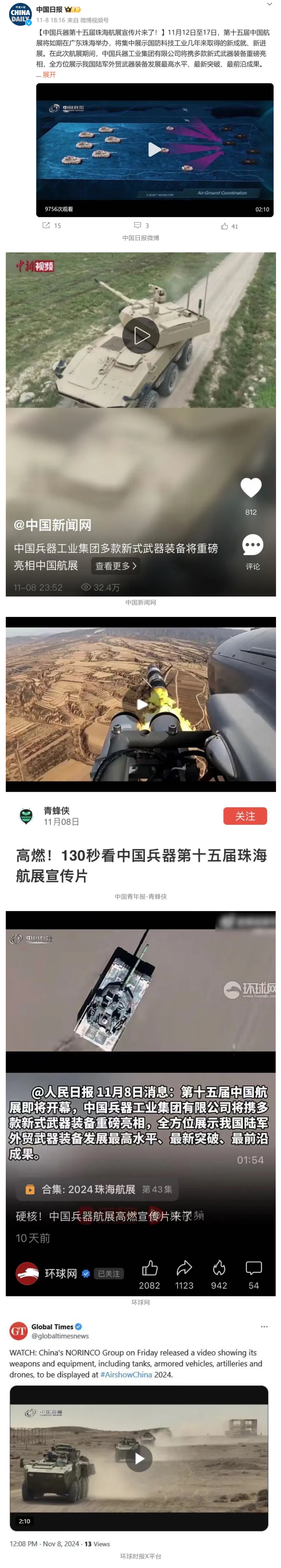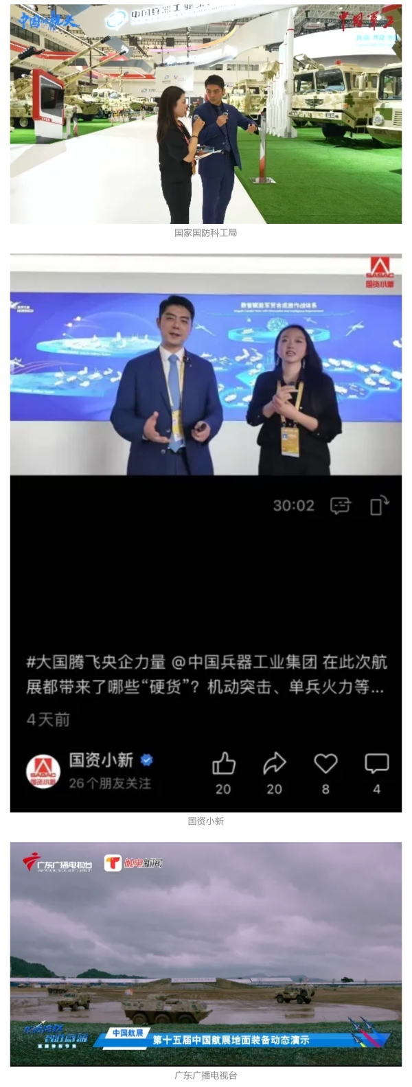 11月13日央視新聞《藍(lán)天之約》直播地面裝備動(dòng)態(tài)演示此次航展,央視綜合頻道《新聞聯(lián)播》《晚間新聞》、新聞?lì)l道《新聞直播間》《新聞30分》《朝聞天下》《共同關(guān)注》《東方時(shí)空》《午夜新聞》、財(cái)經(jīng)頻道《天下財(cái)經(jīng)》《經(jīng)濟(jì)信息聯(lián)播》《正點(diǎn)財(cái)經(jīng)》《第一時(shí)間》、中文國(guó)際頻道《今日環(huán)球》《中國(guó)新聞》、國(guó)防軍事頻道《軍事報(bào)道》《正午國(guó)防軍事》《國(guó)防軍事早報(bào)》《軍迷行天下》等欄目共播出兵器工業(yè)集團(tuán)參展相關(guān)新聞報(bào)道40余條。11月10日央視新聞?lì)l道《新聞30分》11月10日央視中文國(guó)際頻道《中國(guó)新聞》11月10日央視國(guó)防軍事頻道《軍事報(bào)道》11月11日央視國(guó)防軍事頻道《正午國(guó)防軍事》
